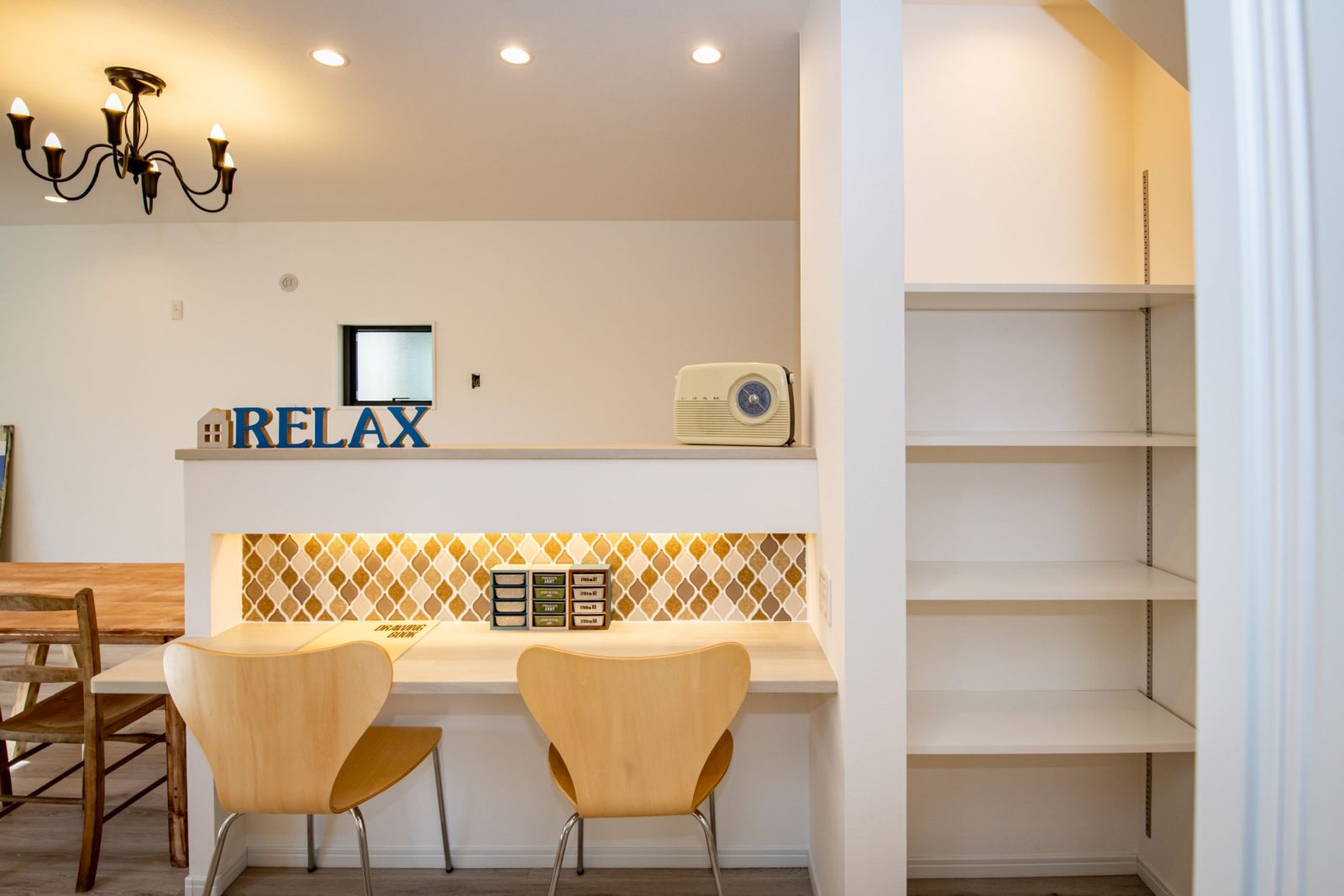 目に飛び込んでくるのは、モザイクタイルが印象的なカウンターデスク。