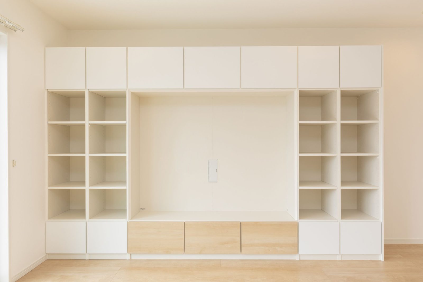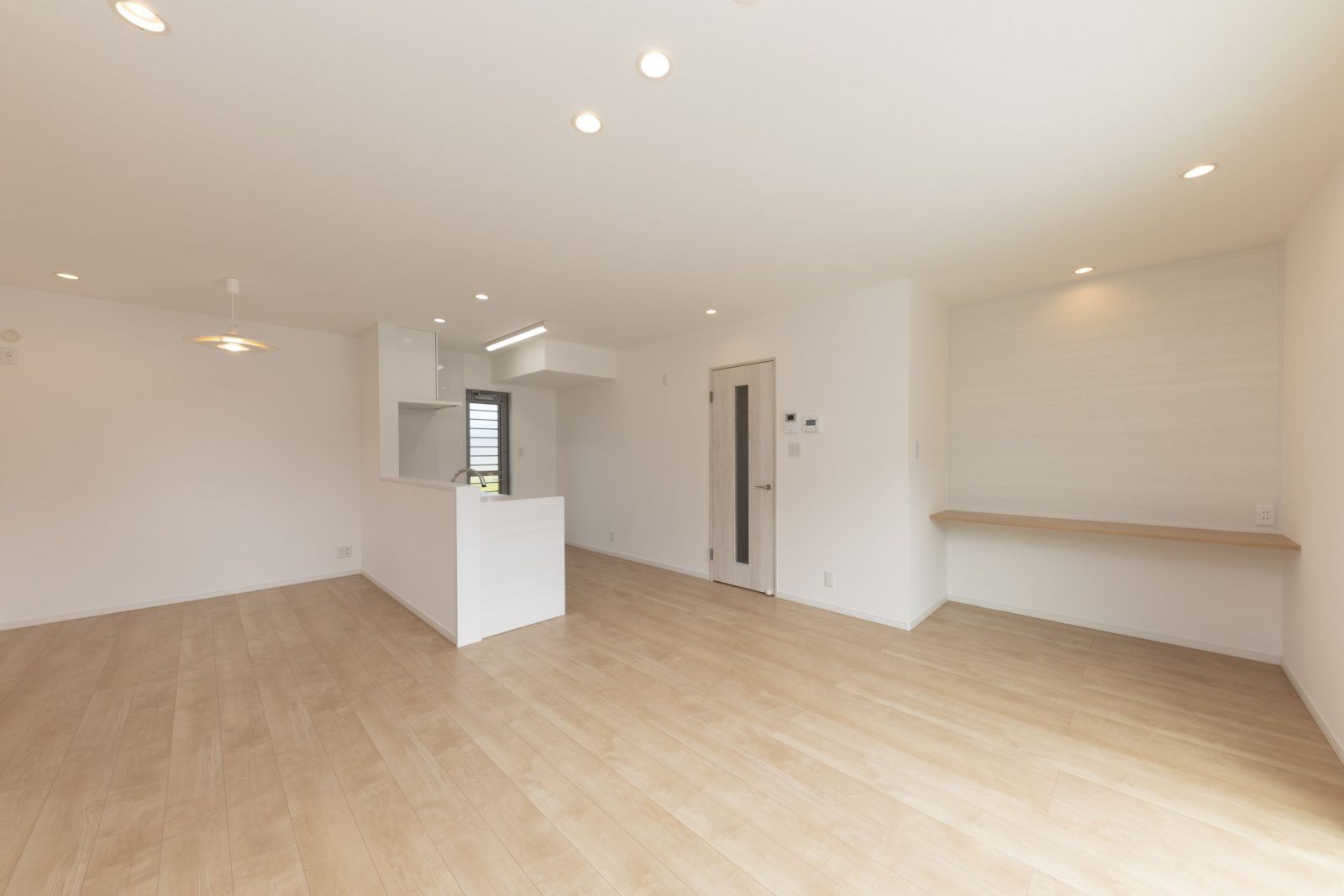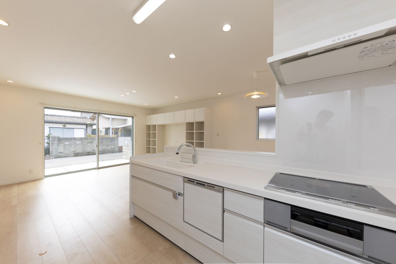 リビングダイニングに入れば大きな壁付けの収納が目に飛び込んできます。