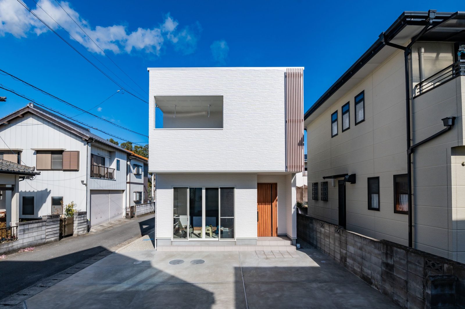 白い外壁に、4枚のテラス窓が特徴的な佇まいの外観。