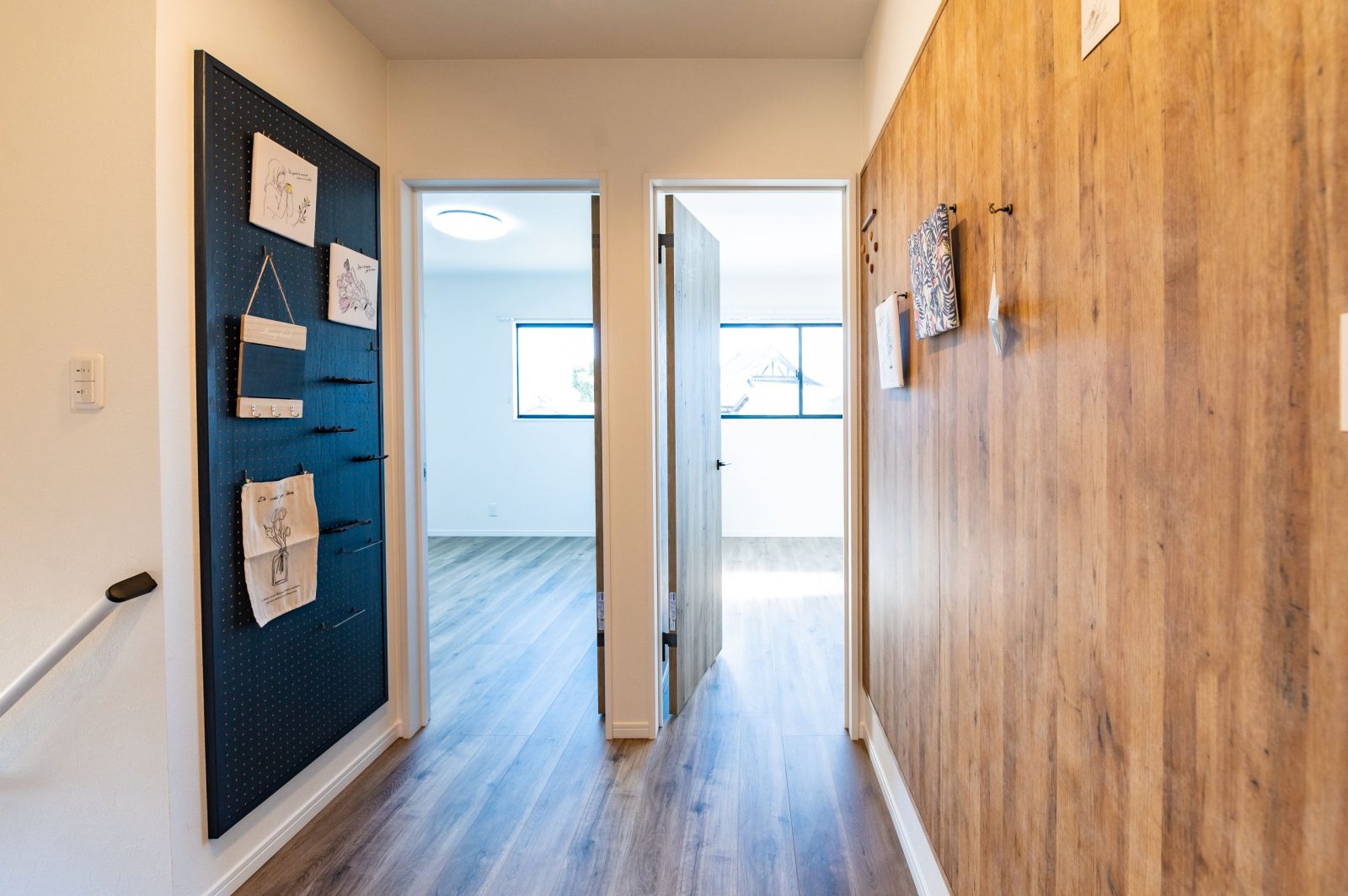 反対側の壁にはネイビーカラーの有孔ボードを設置。