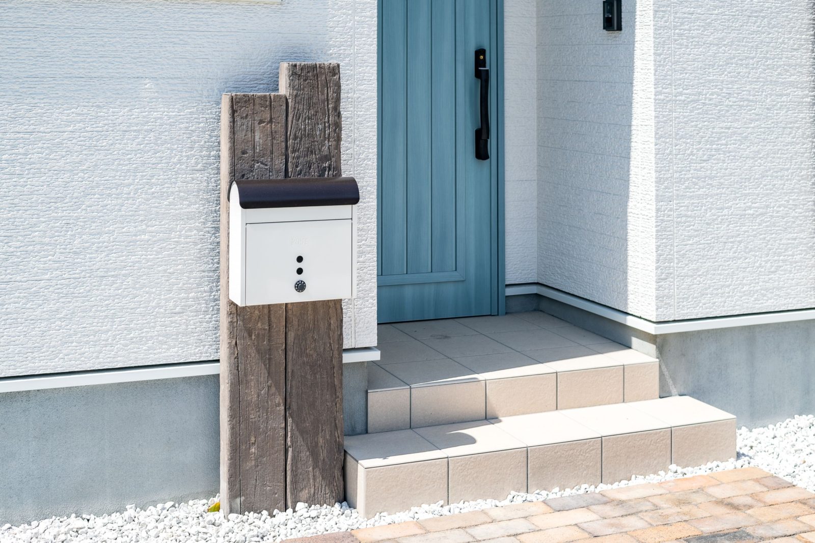 水色の玄関ドアがアクセントになった可愛らしい佇まいのお家。